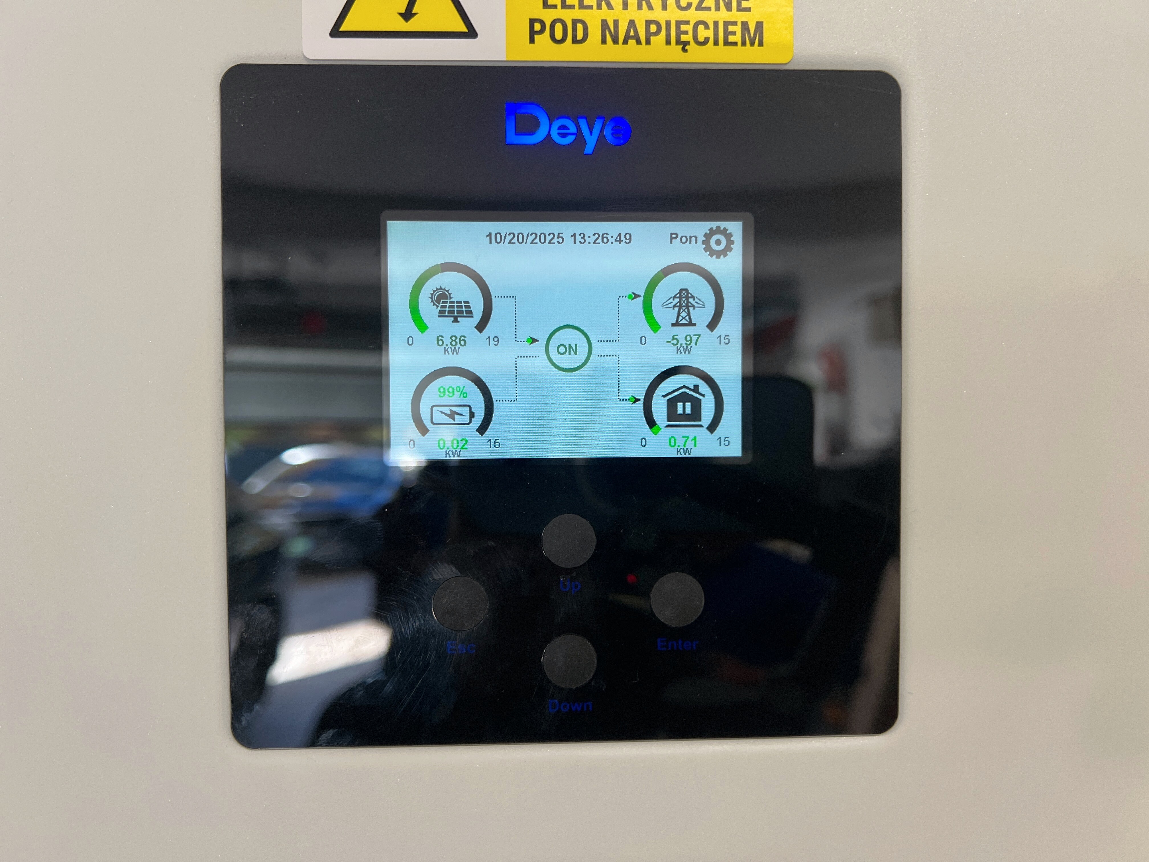 Dzięki modernizacji system działa teraz w trybie autokonsumpcji z magazynowaniem energii, co pozwala ładować samochód elektryczny bez obciążania sieci. Falownik Deye zapewnia ciągłość zasilania (UPS) w przypadku awarii prądu, a turbina wiatrowa dodatkowo zwiększa niezależność energetyczną obiektu.