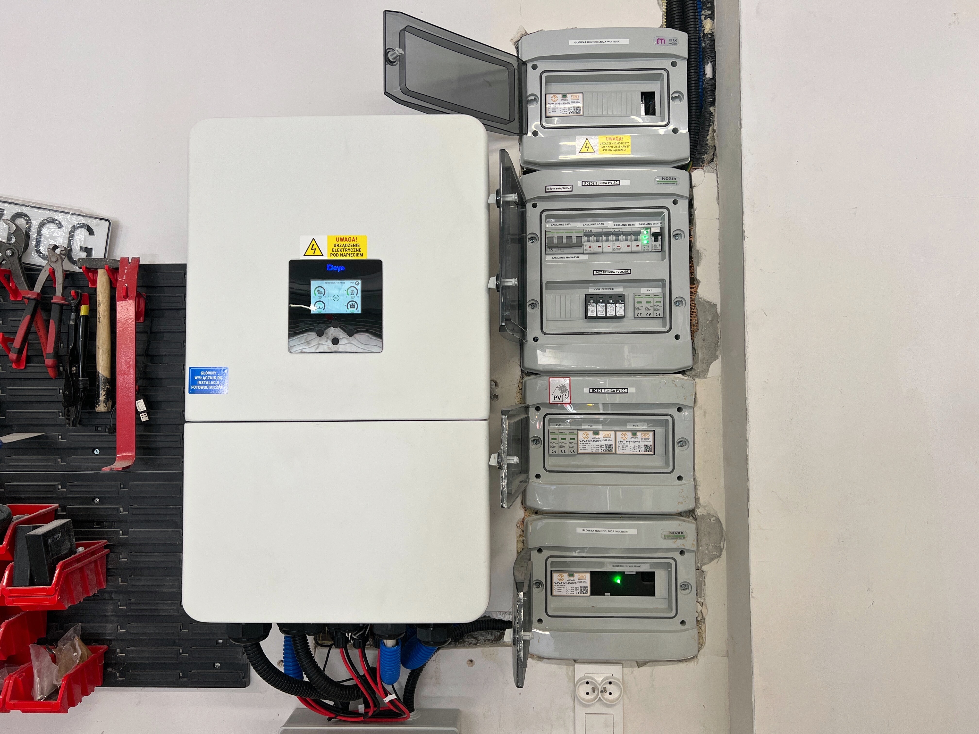 Montaż falownika hybrydowego Deye z funkcją zasilania awaryjnego (UPS), który odpowiada za inteligentne zarządzanie przepływem energii pomiędzy panelami, magazynem, siecią i obiektem.