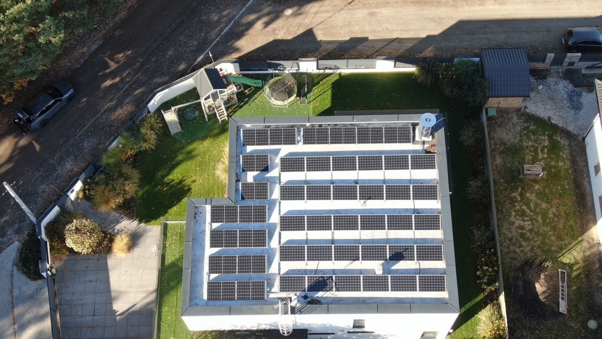 16 kWp paneli fotowoltaicznych Trina Solar Clear Black – estetycznych i wydajnych, idealnie komponujących się z architekturą obiektu.